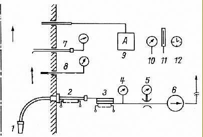 1 Entnahmesonde 2 Ansaugrohr (ggf. beheizt) 3 Meßfilter (ggf. beheizt) 4 Druckmesser 5 Drosselstelle mit Differenzdruckmesser 6 Saugzuggebläse 7 Prandt'l-Staurohr mit Differenzdruckmesser 8 Temperaturfühler mit Anzeige 9 Analysengerät (Feuchte, Zusammensetzung) 10 Barometer 11 Außentemperatur 12 Zeitmesser